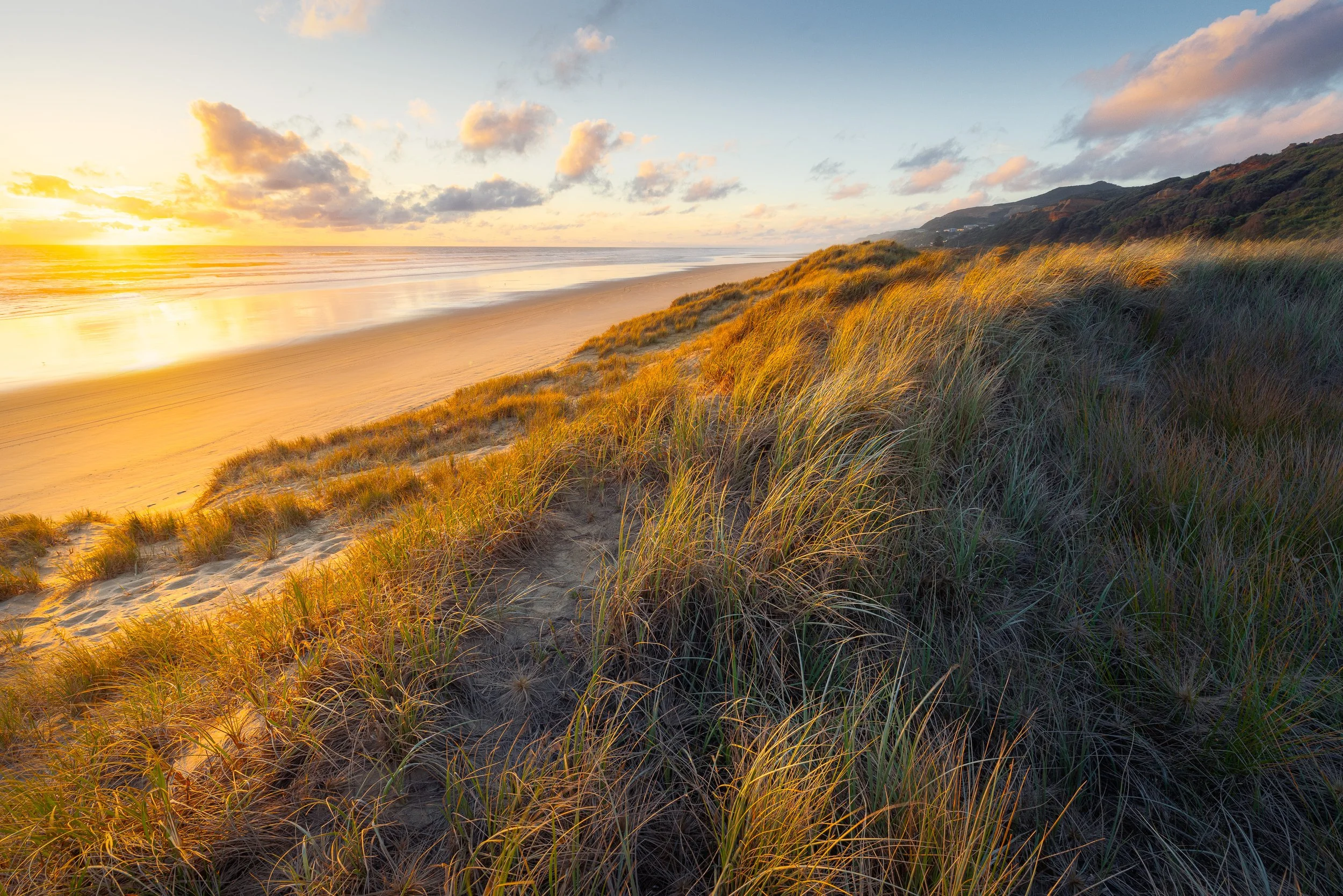 Exploring the giant sand dunes from mid-afternoon to dusk was a memorable experience. After the initial climb to the top of the first dune, we were immersed in a desert-like landscape—rolling dunes that seemed to stretch endlessly along the Tasman Sea. The clouds above shifted rapidly, transitioning from light, fluffy wisps to heavy, dense formations, creating endless opportunities for different compositions. However, you had to act quickly, as the sunlight on the dunes would disappear as quickly as it appeared.