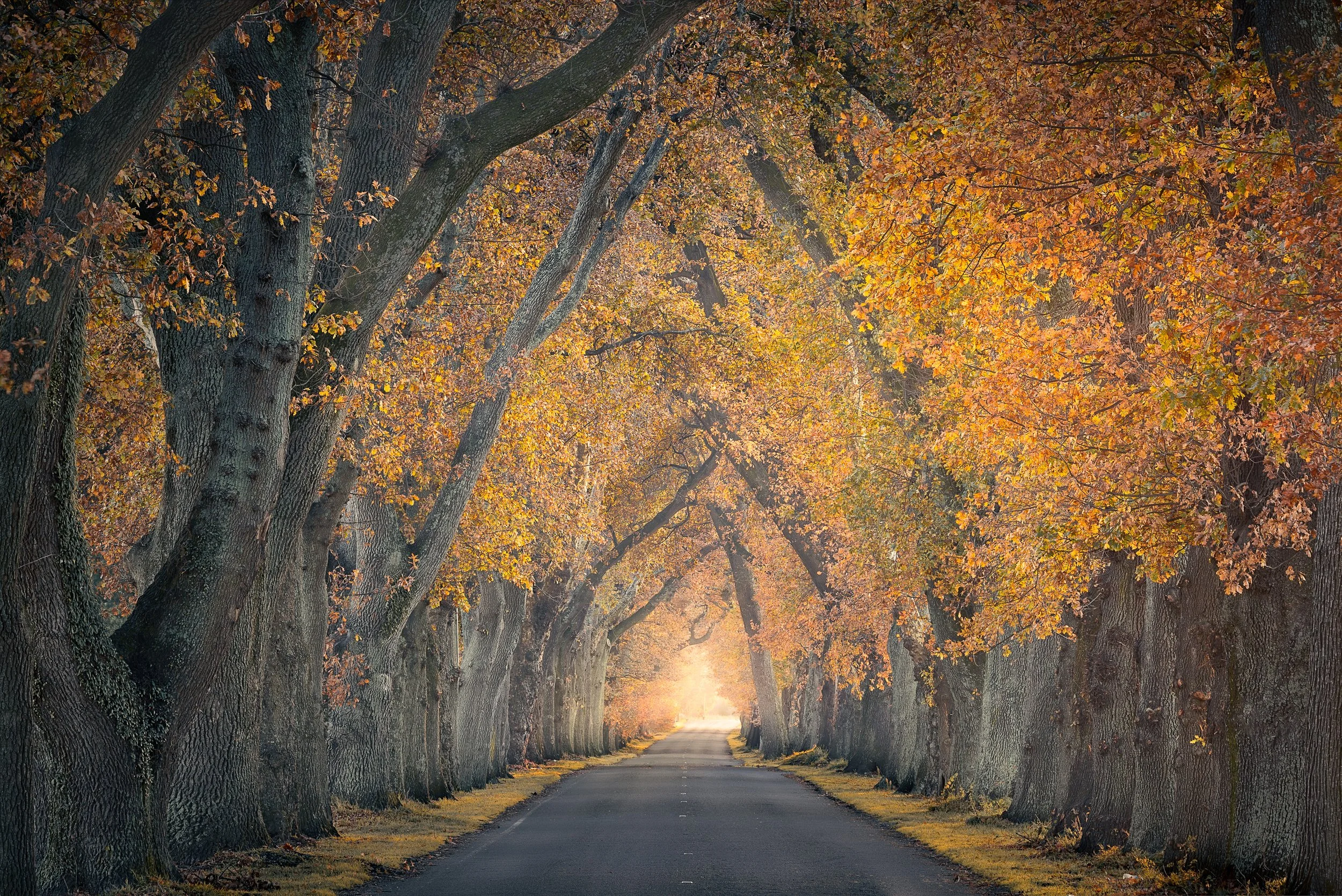 The tree lined path along Waimarama Road, combined with autumn colours and lit up, early morning mist, create a vanishing way into the light.